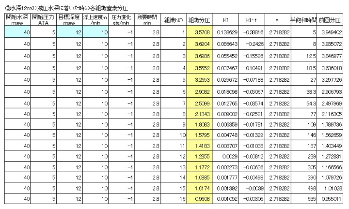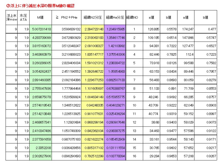 | ★改正後の計算式の検証-空気潜水 実際に計算式を使って、空気潜水計画をしてみました。 ------------------------------ ・使用ガス:空気のみ ・作業水深:40msw(海水) ・潜水時間:水深40mまで4分で潜降+作業時間は60分 ------------------------------ ①、はじめに、水面から作業水深に潜った間の、各組織に蓄積される窒素の分圧を求めます。各組織の窒素分圧を見ると、予想通り速い組織から遅い組織に向かって分圧が低い事が解ります。ちなみに潜降速度は10m/分です。 ②、次に、水深40mで60分の作業を行った時の分圧を加えて、浮上開始時の各組織の分圧を求めます。同時に各組織で許されるM値=環境圧による可能限界組織分圧=可能限界浮上水深を求めます。減圧停止間隔を一般的な3mとした場合、この時点で水深12mまでの浮上なら各組織のM値を超えないことが解ります。 ➂、よって、浮上速度10m/分にて水深40mから減圧停止水深12mまで浮上した時の分圧を計算します。各組織分圧を見ると、速い組織は窒素の排出が始まり、分圧値が下がっていますが、遅い組織はまだ若干増えているのが解ります。 ④、次の減圧停止水深9mまで許される各M値を先に求めます。次に、各組織がその値より低くなるまでの水深12mにおける、減圧停止時間を求めます。結果は6分の減圧停止となりました。 ⑤、水深12mの減圧停止完了から9mまで浮上した時の各組織の分圧を求めます。 あとは浮上まで、ここまでの計算を繰り返しを行います。 以上により、高圧則の計算式を用いた結果、水深40m、作業時間60分を空気だけで潜水すると、減圧停止は・・・ 水深 12m 6分 9m 12分 6m 22分 3m 42分 以上となりましたが、上記の計画を他の減圧理論(アルゴリズム)数種類の計算と比べた結果、減圧時間は1番短い値=保守率の低い値いでした。しかし、今までのように、この計算式をそのまま使用する義務はありません。今回の改正でも、上記の計算式は最低限であり、それ以上に保守率が高くなる計画を推奨しています。 言い換えれば、私達は様々なアルゴリズムによる計画&ダイビングコンピューターを使える事になったのです。これは大変ありがたく、貴重な事だと思います。 よって高圧則のM値の計算式や値を変えても良いでしょうし、一般的に使用されている、減圧プランニングソフトを使用しても良くなりました。いずれにして私の計算が合っているなら、高圧則の計算式をそのまま使用した潜水は・・・・・お勧めできません。 また、計算やソフトなどに不慣れな方は、従来よりも保守率が高く、従来と同じように水深と時間で引ける表(ダイブテーブル)がありますので、それを使用すれば良いと思います。 --------------------------------------------------------------- 追伸、2016年4月6日 掲載 計算式を用いて、今度はヘリウムと加速減圧を取り入れた潜水を計画してみました。 ・潜降速度:10/min ・作業水深:50m ・作業時間:15min ・使用ガス:Tx20/30 ・減圧ガス:EAN90 ![]() 以上となりました。 ----------------------------------------------------------------- ★高酸素の使用は有意義です。 今まで呼吸ガスに空気だけを使用して来た潜水作業者に、水中で高濃度酸素を呼吸させる事に不安を抱いている方や事業者の声を聴きます。でも、現在では一般のダイバーなども小脇に酸素を携帯し、安全停止中に呼吸することで、減圧症への保守率を高めています。潜水時間の長い作業者にとっては、なおさら有意義な改正であると信じます。大切なのは危険と決めつける事ではなく、使用者に正しい教育を行ってあげることだと思います。今回の改正により、業界の中で隠れ減圧症や減圧症で苦しんでいる方達が、これ以上増えない事を願っています。 ★肺酸素中毒よりも中枢神経系酸素中毒(CNS)に注意しましょう。 肺の酸素中毒よりも、CNSによる水中での痙攣発作が危険です。改正規則にはCNSに対する時間制限はありませんが、酸素分圧が1.6ataなら45分、1.5ataなら120分、1.4ataなら180分を呼吸限界として下さい。さらに限界値なので、安全を考えて計画や実践では余裕もって各限界時間の80%以内の呼吸時間になる様にしましょう。 時間制限を超える場合は、25分ごとに空気で5分間呼吸する方法もありますが、ダイビングベルや減圧室の様なドライ環境でないと、危険かもしれません。 ★作業中の酸素分圧は1.4ata以内にしましょう。 少なくとも、潜水作業者が作業を行う水深では、酸素分圧が1.4ata以内になるようにしましょう。作業労働により体内の二酸化炭素が高くなり、酸素中毒:CNSの発症率が高くなるからです。よって酸素分圧1.6ataで呼吸するのは減圧停止中など、労働を伴わない時にしましょう。 ---------------------------------------------------------------------- あとがき 以上、ここまで読んで下さり、ありがとうございました。43年振りの抜本的な高圧則の改正に伴い、業界関係者の中には戸惑いや不満も多々あると思います。しかし、今回の改正が海に囲まれた日本の潜水業界にとって、世界に貢献できる潜水技術と知識に繋が
